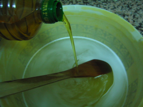 Añadimos el aceite mientras removemos con la espátula. Como veis el aceite parece limpio, pero está muy filtrado para que no tenga impurezas.