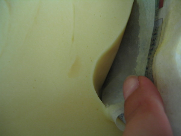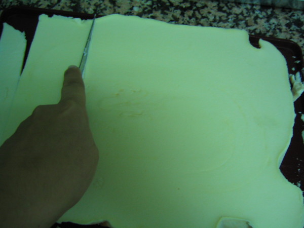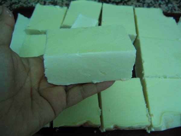 A las 24 horas comprobamos que ya ha cuajado, pero aún no está seco del todo, es cuando hay que trocearlo para que este proceso se haga con mayor facilidad. Aquí tenéis el jabón, que ha quedado blanquito y muy fino.