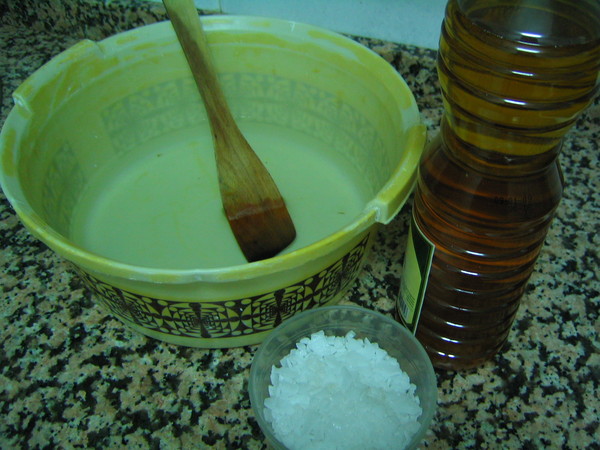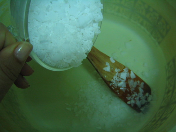 En un barreño ponemos el agua y la sosa, este barreñito lo utilizo sólo para esto, como veis ya tiene años. Removemos con una espátula de madera para que la sosa se disuelva, tened cuidado ya que puede quemar y sus vapores dañar, pero con un mínimo de cuidado no hay peligro.