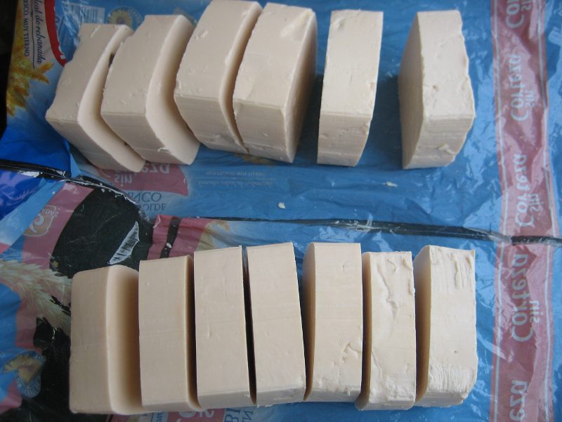 2) Pasados dos o tres días ya podemos dar la vuelta al envase para que salga la pasta, sale fácilmente y a continuación podemos comenzar a cortar el jabón, la pasta estará cuajada pero tierna para que el corte nos sea más fácil. Os dejo las fotos secuenciales y lo bueno de este envase es que podemos volver a reutilizarlo para guardar de nuevo el jabón que acabamos de cortar y así quedan en su propio envase sin que nos estorbe en la despensa.