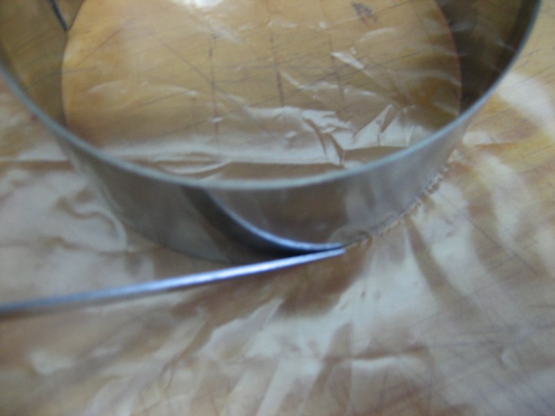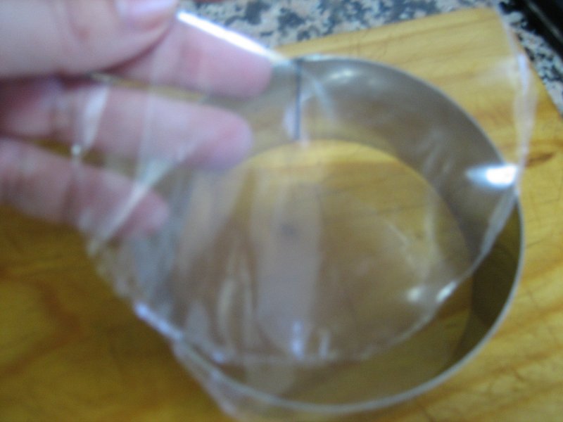 Lo primero que hay que hacer son los discos que iran en ambos lados de la hamburguesa, según las hamburguesas que se hagan hay que hacer el doble de discos. Para ello colocamos el plástico y encima el aro, marcamos con el cuchillo alrededor de él y luego lo cortamos con las tijeras.