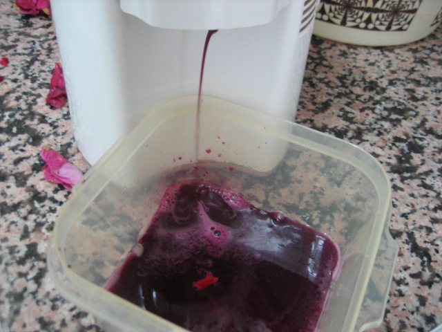 Licuamos los pétalos en la licuadora, como podéis ver el resultado es oscuro porque las rosas eran rojas, y salió como medio vaso aproximadamente de jugo. Si no se tiene licuadora batirlos con la batidora y un poquito de agua, luego filtrar con ayuda de un colador, pero no se cómo quedará, aunque imagino que muy parecido.