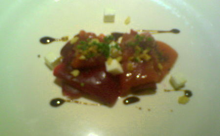 Un atún impecable, sin una sola fibra, muy terso, con un rojo muy vivo, combinado con láminas finitas de remolacha, que pretendian jugar al escondite diciendole al cliente, que es atún y que es remolacha. Un plato de puro producto con el que lograron su propósito, no robarle el más mínimo protagonismo al producto principal (unos 60 gr. de producto aproximadamente).