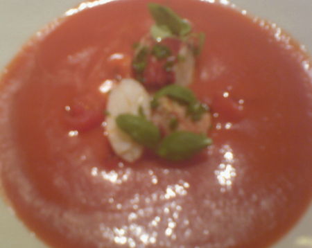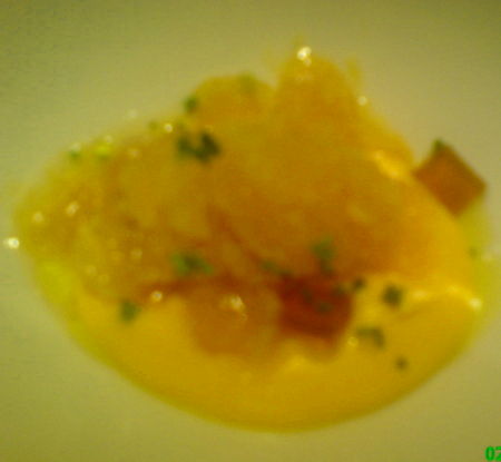 Un suave y agradadable gazpacho de bogavante y fresones, abrió el turno de los entrantes. Un plato ya «clásico» en el que debo destacar la buena cocción del bogavante y el acierto en la presentación del gazpacho, un poco flojo de vinagre en mi gusto. Como único pero, la adición de brotes de albahaca en la sopa ( cierto es que albahaca y tomate son una combinación muy acertada, pero llegaba a predominar sobre el archiconocido sabor del gazpacho).