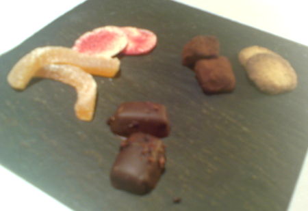 Crema de vainilla con texturas de frutos rojos, repetía la propuesta, una nueva gelatina, y nuevamente vainilla. Solamente el crumble aportaba algo diferente al plato, una textura agradable, aunque posteriormente en los petit fours nos ofrecieron nuevamente galletas ( lo dicho, demasiada repetición en la propuesta). El postre estaba bueno, aunque en mi opinión un postre más ligero hubiese sido más adecuado, sobretodo considerando la posibilidad de servir 2 postres.