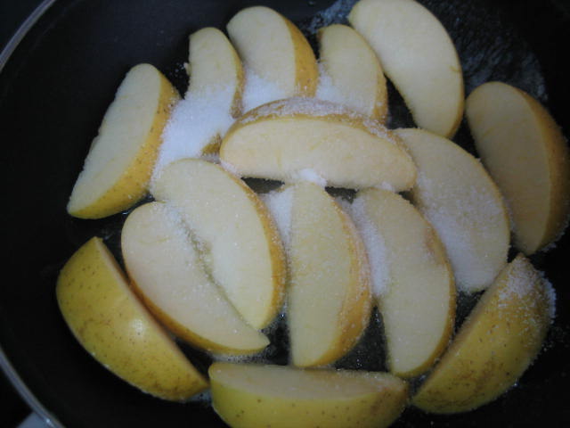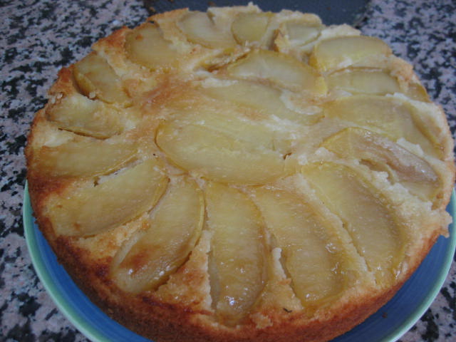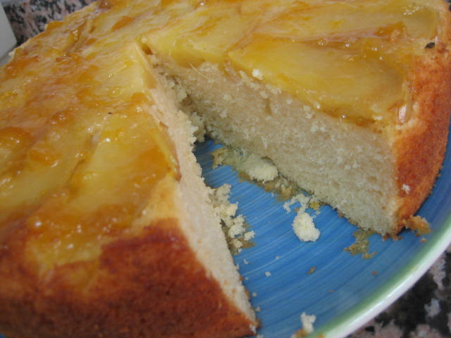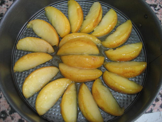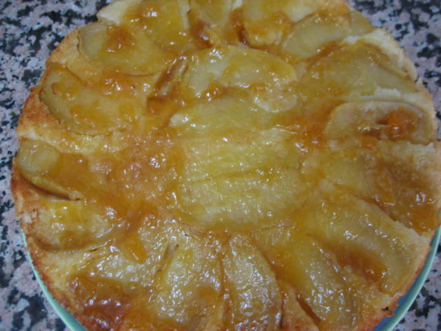 Lavamos y descorazonamos las manzanas, las troceamos en gajos gruesos dejando la piel. Ponemos en una sartén la mantequilla, los gajos de manzana y el azúcar. Se han de hacer ligeramente, ya que luego van al horno y terminan de hacerse. Colocamos la manzana en la base del molde de una forma decorativa, como se quiera. Batimos el resto de los ingredientes y echamos la masa resultante en el molde sobre la manzana, con cuidado para que no se desplacen los gajos. Metemos al horno, se tiene que poner con antelación para que esté en su temperatura al meter el bizcocho, a unos 200ºC y durante 40 a 45 minutos, la superficie del bizcocho debe de estar ligeramente dorada. Damos la vuelta al bizcocho con cuidado una vez que esté templado. En la misma sartén que utilizamos para las manzanas pondremos 3 cucharadas de mermelada de melocotón y una del puré de manzana. Dejamos al fuego un par de minutos, y ponemos por encima del bizcocho con ayuda de una brocha.