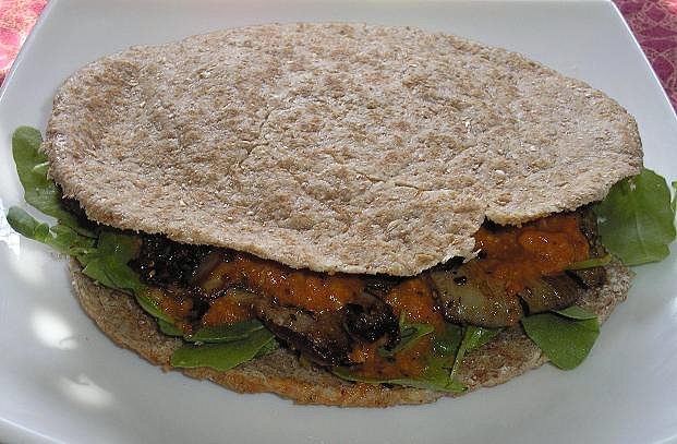 Pita con rúcula de setas de cardo y salsa romesco