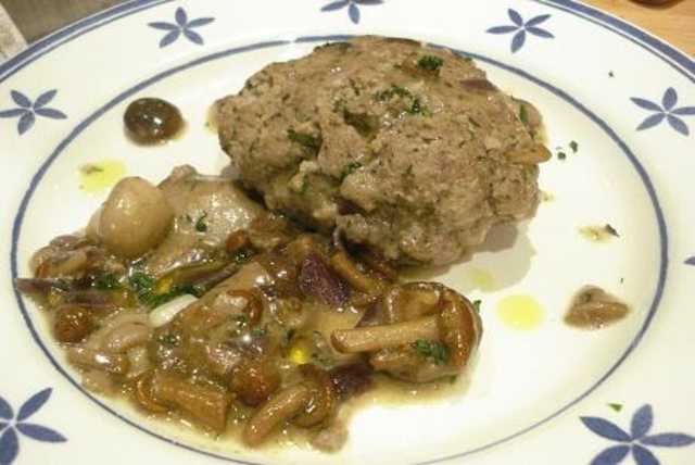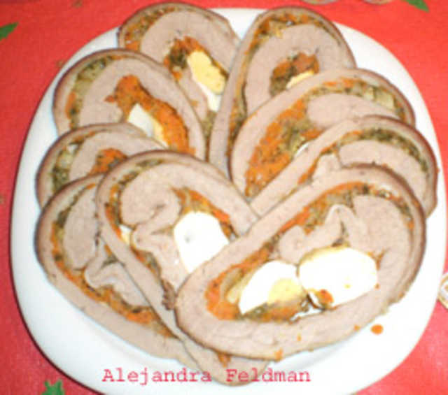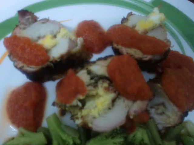 Solomillo relleno de queso, jamón y huevo con salsa de pimientos
