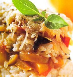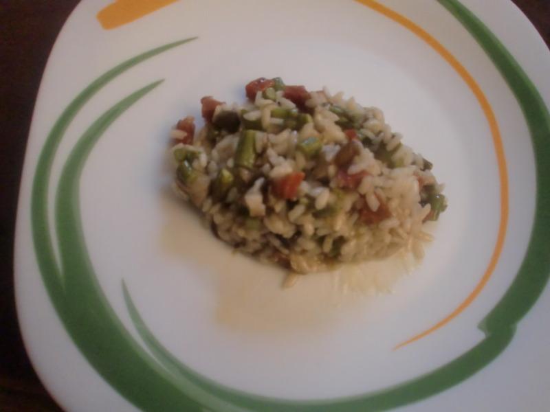 Risotto con jamón, espárragos verdes y setas chinas