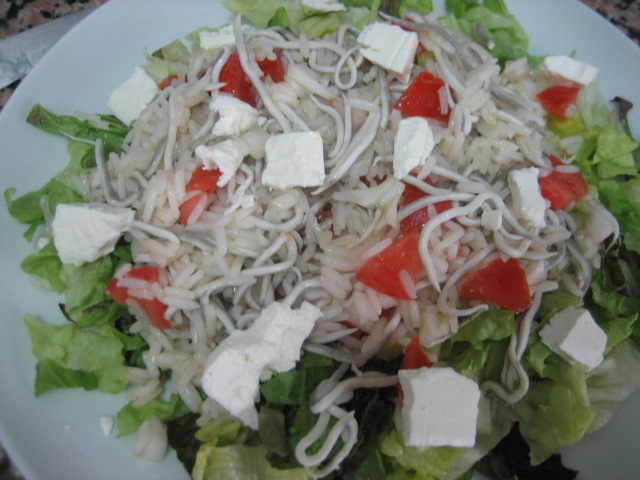 - Ensalada con arroz, gulas y queso
